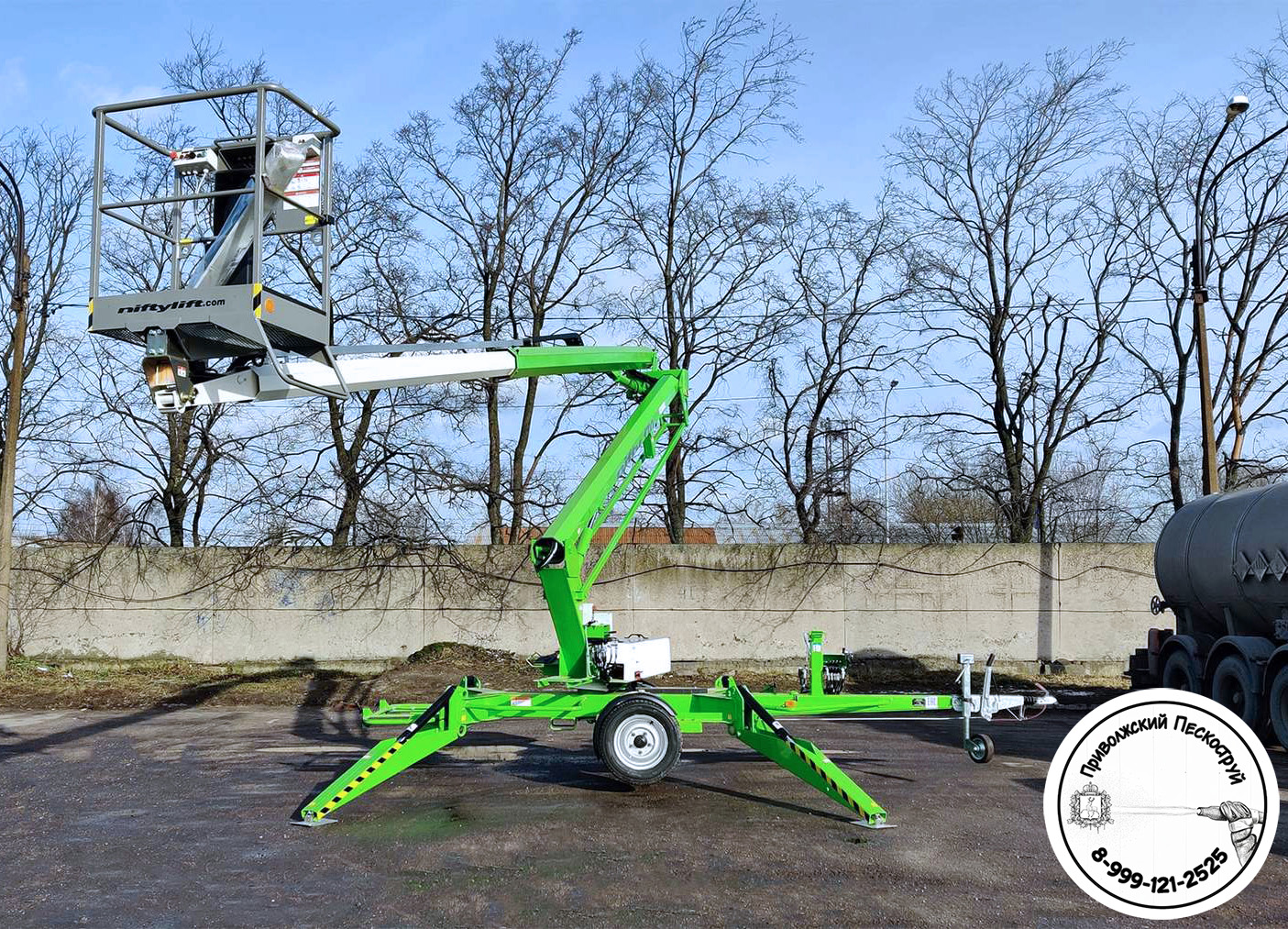 В нашем распоряжении имеются коленчатые подъемники, которые позволяют поднимать оператора не только вверх от уровня земли, но позволяют достигнуть любой удаленной плоскости для его пескоструйной обработки (например, вершина бочки бензовоза) — так как имеют горизонтальный вылет.